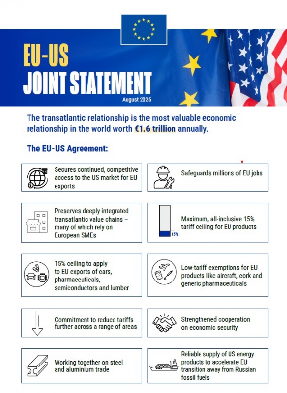 Le 27 juillet 2025, le Président Donald Trump et la Présidente de la Commission européenne, Ursula von der Leyen, se sont entretenus en Ecosse et ont annoncé que les Etats-Unis et l’UE ont « conclu un accord » commercial prévoyant des droits de douane généraux de 15 %. Sur les exportations européennes. L'Union européenne s’est engagée à 750 milliards de dollars (soit l’équivalent de 638 milliards d’euros) d’achats d’énergie sur une période de 3 ans et à 600 milliards d’investissements supplémentaires aux Etats-Unis (notamment militaires). Le Président Trump s’est dit heureux d’avoir conclu le plus grand » accord jamais conclu en matière de commerce, et y voit une promesse « d’unité et d’amitié ». Par ailleurs, le Président américain a précisé que le taux de 15% sur les produits de l'UE inclut le secteur automobile. La réduction des droits de douane sur les exportations automobiles européennes (fixés à 27,5 % en avril) représentait un enjeu très important, en particulier pour l’Allemagne, première économie de l’Union.